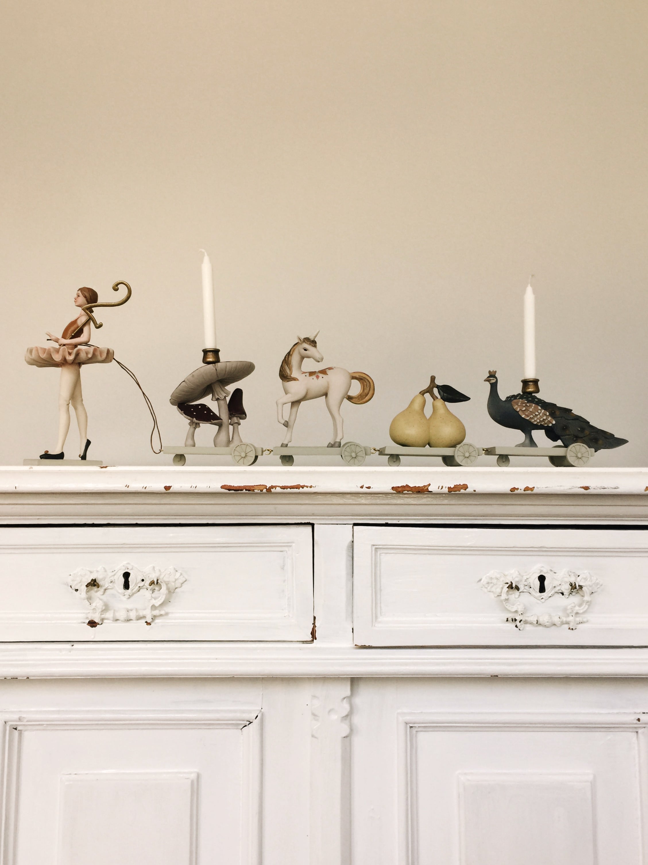 - きのこ、ユニコーン、ナシ、クジャクと一緒に歩くバレリーナ