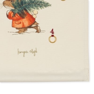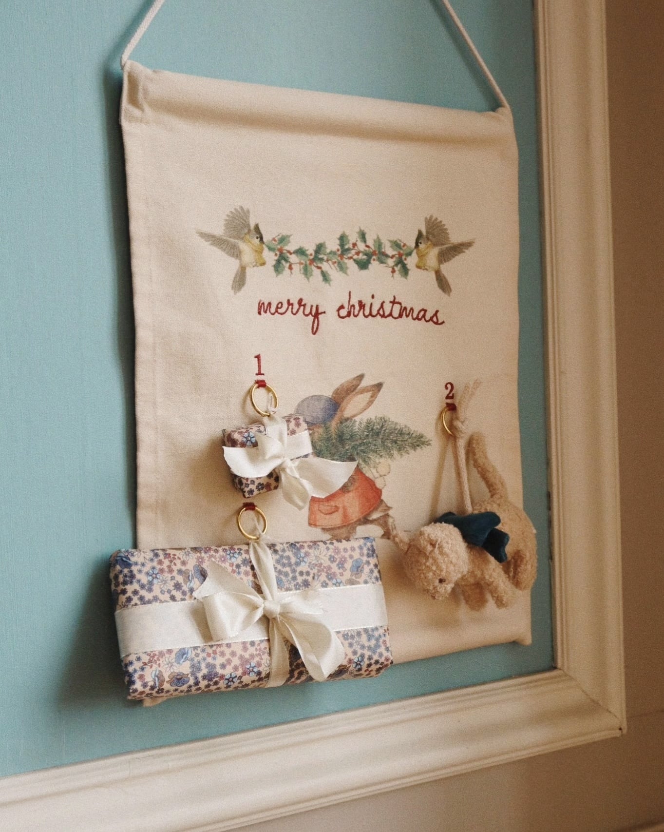 数字が刺繍され、プレゼントを掛けるための 24 個の金色のリングが付いたクリスマス カレンダー。