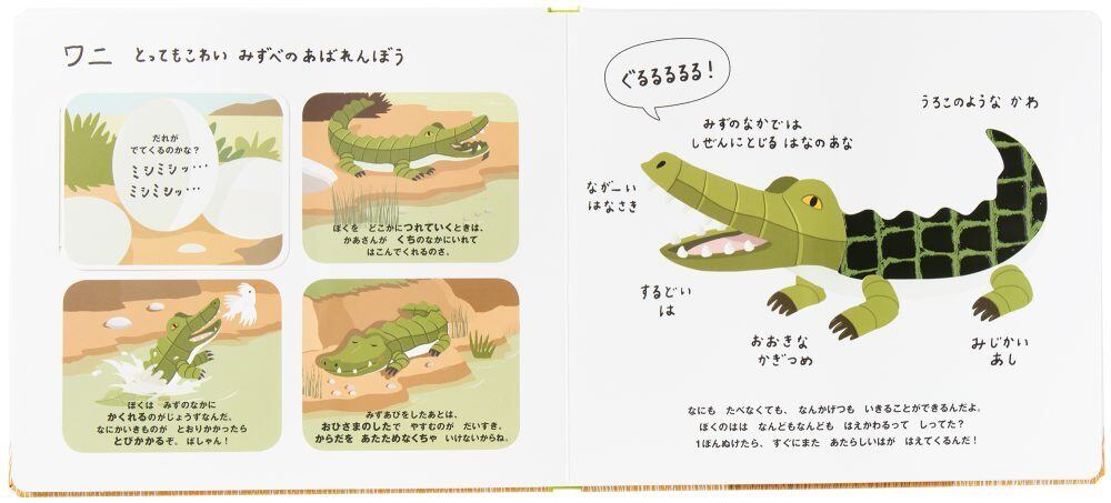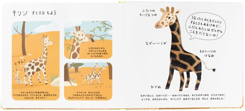 ゾウのゴワゴワした体や、やわらかなライオンのたてがみ、ウロコのようなワニの皮などをさまざまな素材で表現。大自然に生きる動物たちへの想像力を広げます。子どもたちの好奇心にこたえる、さわって学べるしかけ絵本です。