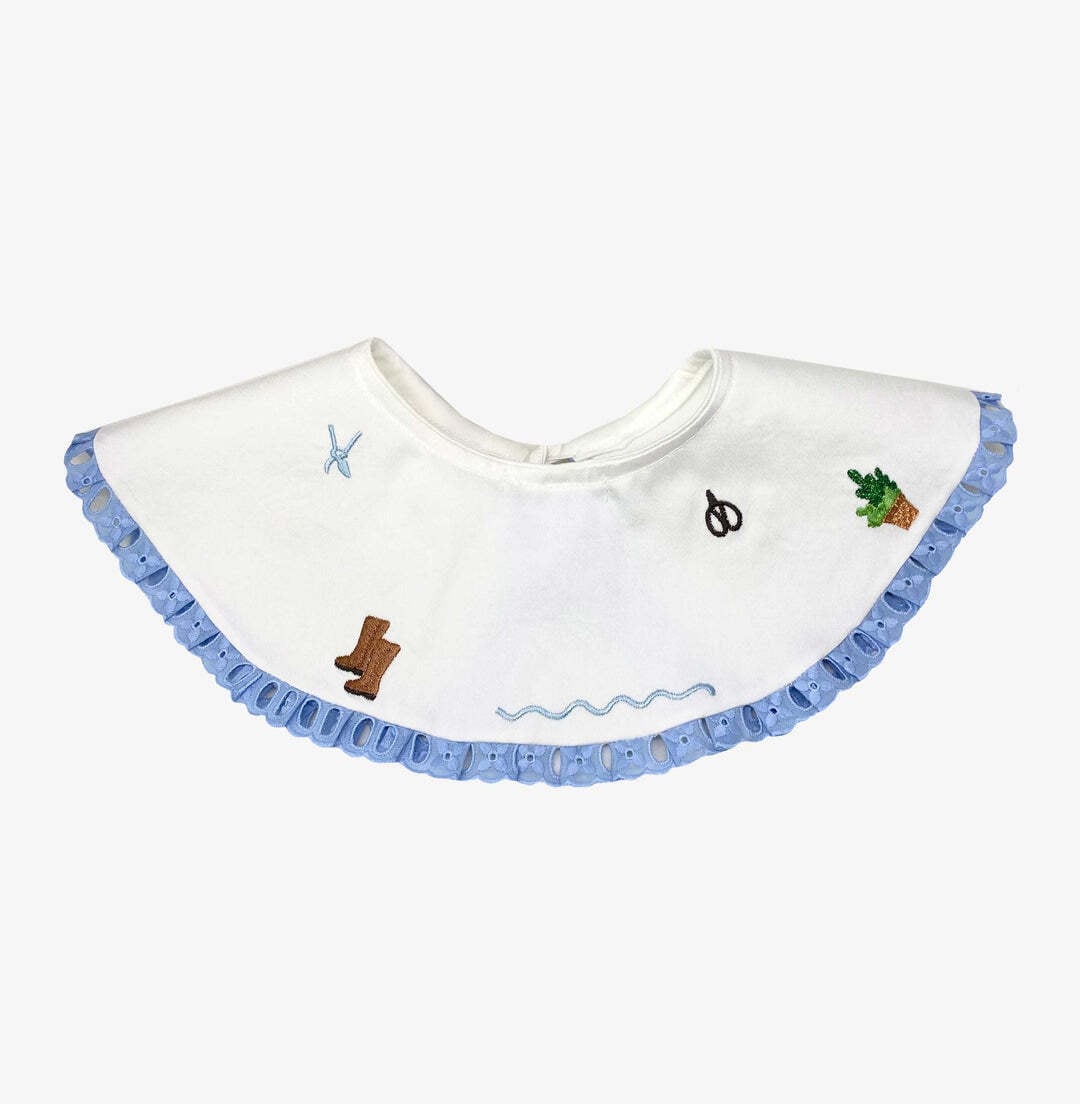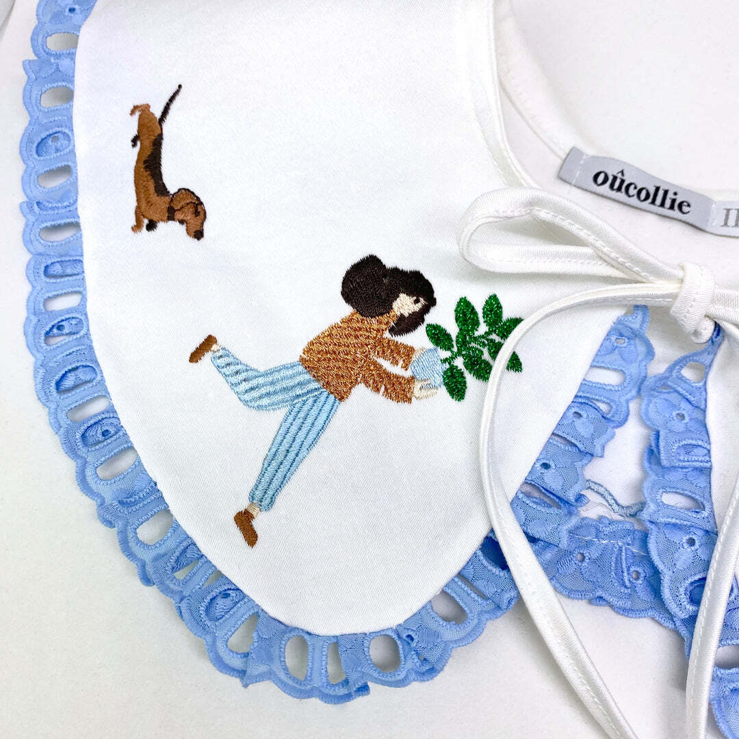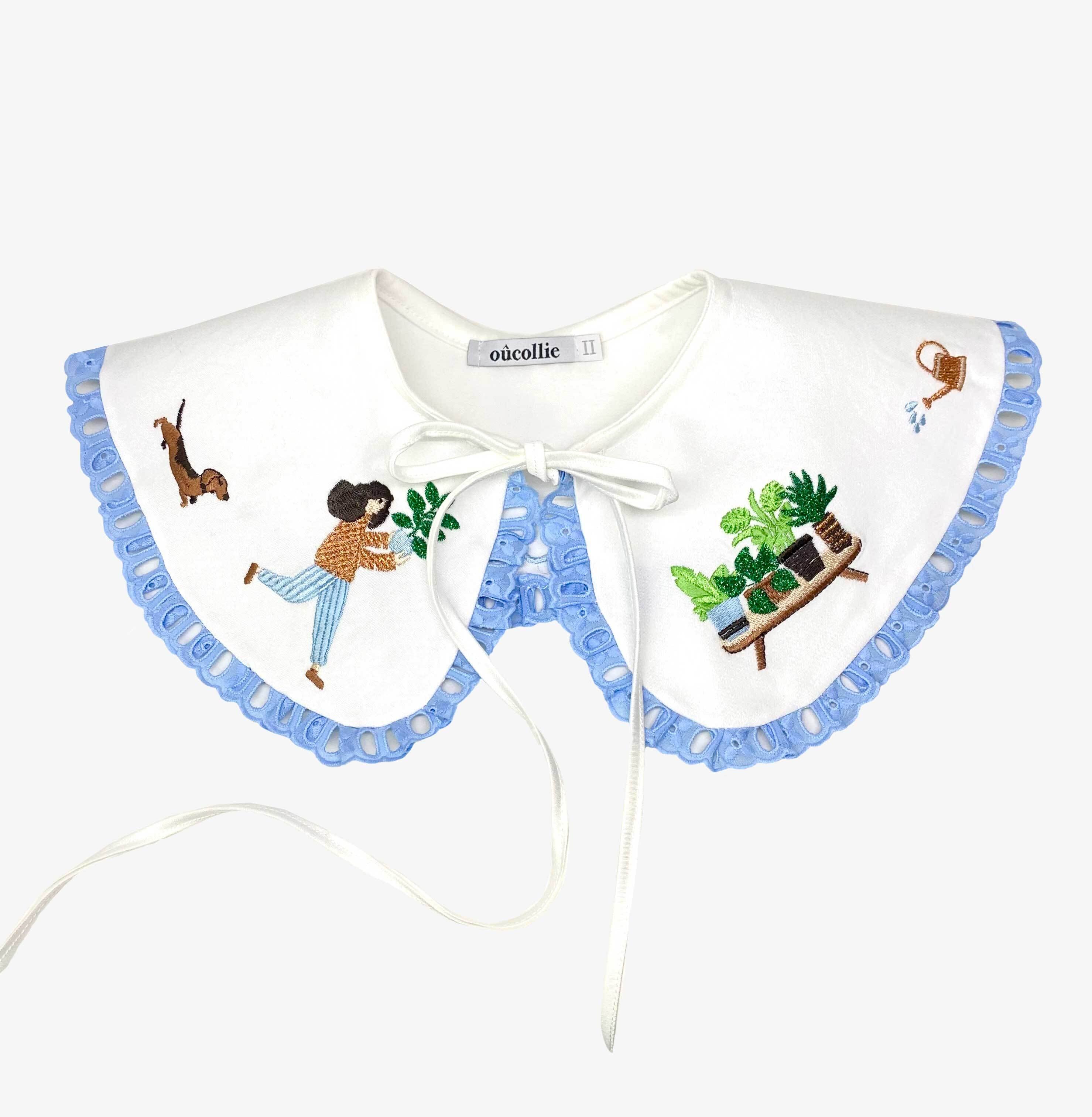 この襟は、ポーランドの職人さんによって「庭」のモチーフがなんとも美しく刺繍されています。ハンドメイドならではの遊び心のある丁寧な刺繍がとっても楽しいアイテム。